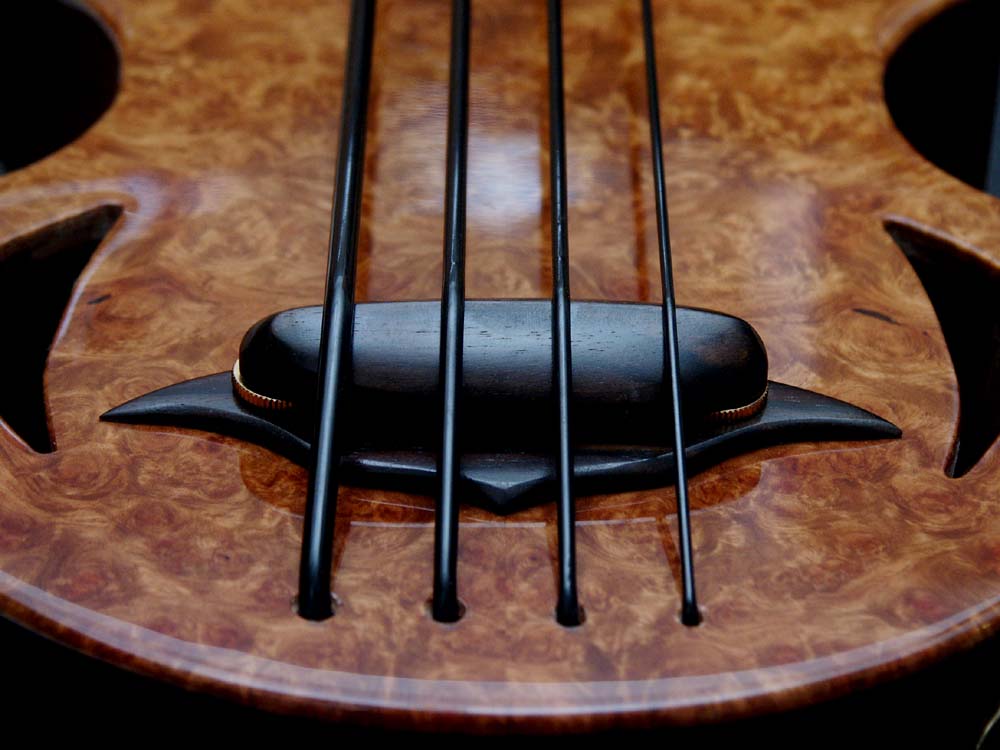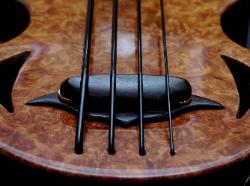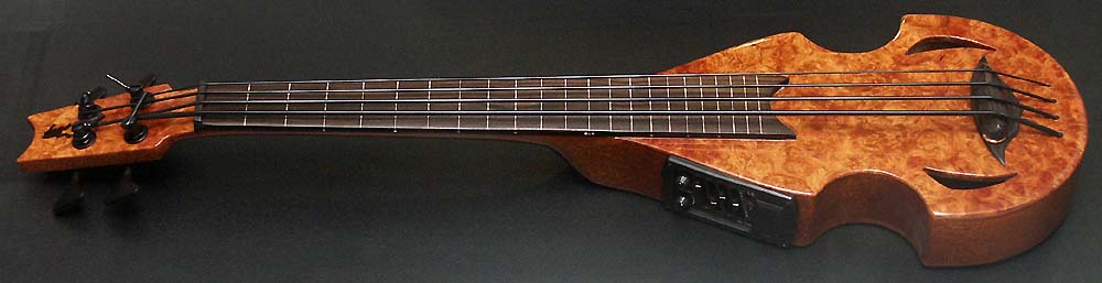 The Scarab is latest of the semi-hollow bass family. Scale length is 22.475" and total length is 31". This bass features active EQ and a floating style adjustable piezo bridge. Pictured example is the prototype instrument and production will be limited. |